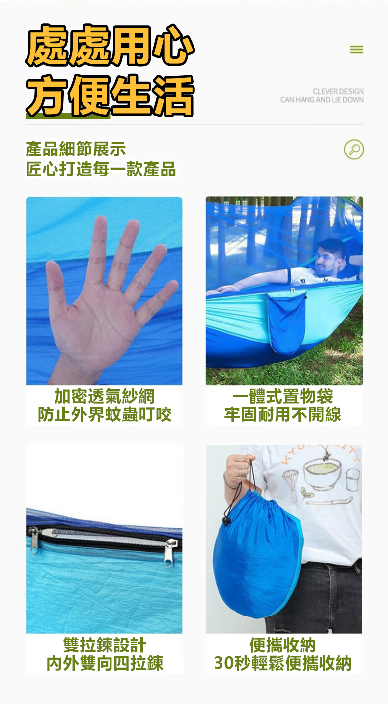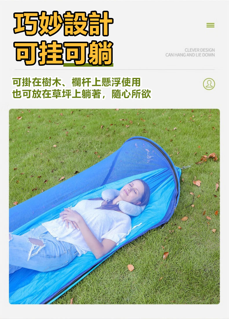 7分鐘前全自動速開戶外帶蚊帳吊床 - 【創意嘗鮮】承重700公斤 速開蚊帳吊床【帶蚊帳 三米綁繩 8號扣】/1入組NT$1298