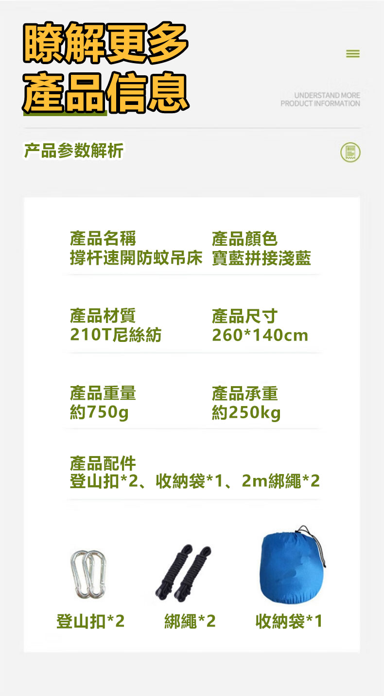 5分鐘前全自動速開戶外帶蚊帳吊床 - 【創意嘗鮮】承重700公斤 速開蚊帳吊床【無蚊帳+三米綁繩+8號扣】/1入組NT$998