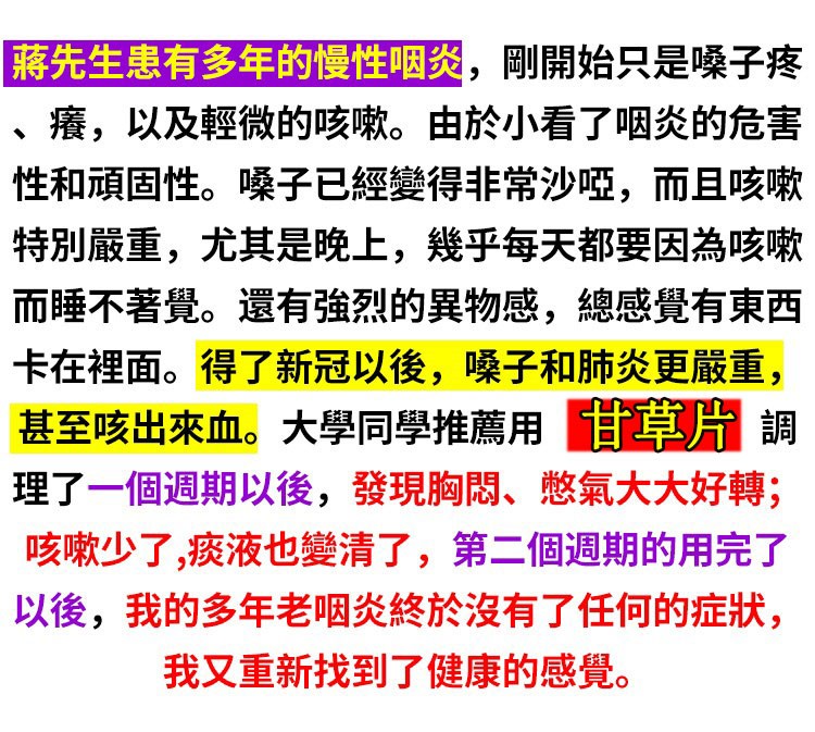 15分鐘前【權威醫師推薦 】咳嗽氣喘止不住,快用甘草片! ! 天然植物草本! 修復肺部損傷,保護肺部健康,每次一顆,化痰止咳,清理肺部有害垃圾! 三十年的老肺病全好了!免疫力也好起來了!! - 療程鞏固裝【保護肺部健康,清理肺部有害垃圾!】12入組--NT$1598