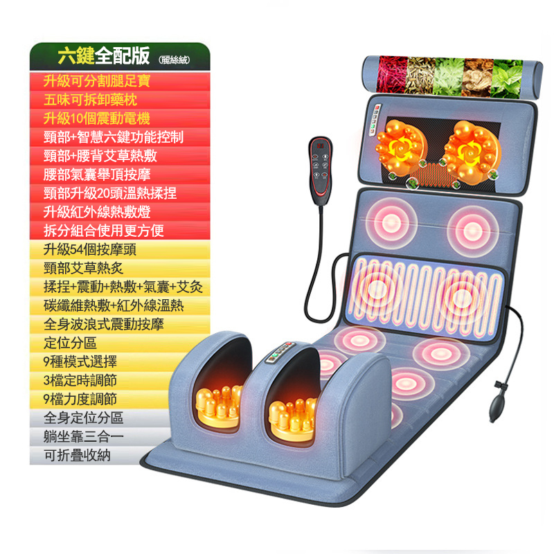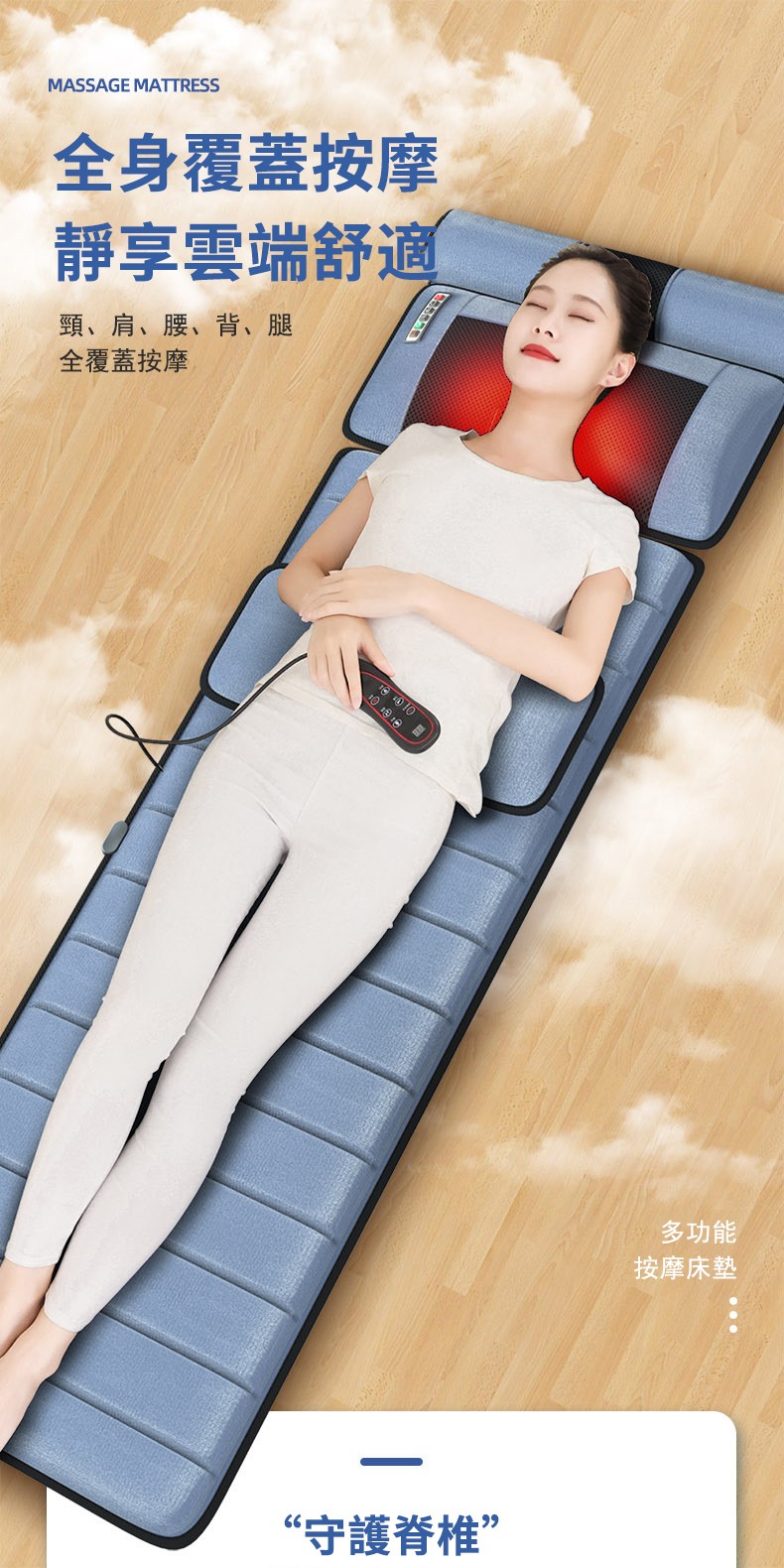 7分鐘前多功能全身按摩床墊 | 電動加熱頸椎、腰部、背部、腿部全方位按摩器,舒緩身心疲勞 - 6鍵旗艦款(6鍵揉捏+震動+氣囊+10電機+腰部熱敷)