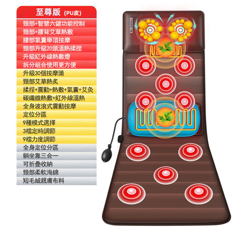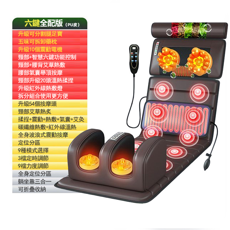 15分鐘前多功能全身按摩床墊 | 電動加熱頸椎、腰部、背部、腿部全方位按摩器,舒緩身心疲勞 - 豪華皮質款五合一可拆卸(藥枕+頸部滾輪+震動加熱+【腿部加熱揉捏】)
