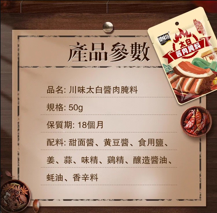 20分鐘前【一袋做6斤】太白醬肉醃料廚師兄川味風乾臘肉料300g/袋醬排骨猪肝 - 超夯下殺【太白醬肉醃料 300g/袋】10入組NT$1680(均價168/入)